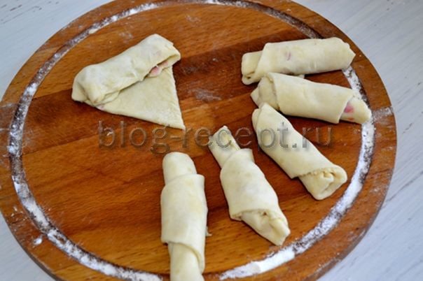 - Консистенция теста варьируется количество добавляемой муки. Оно должно просто раскатываться в тонкий пласт, который нужно нарезать треугольниками, на которые будет выкладываться начинка. Можно сделать рогалики без начинки.