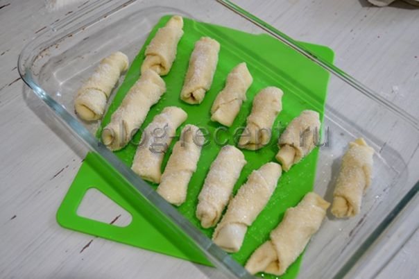 - Далее сворачиваются рогалики, подгибая края немного внутрь. В этом случае разогревшееся повидло не будет вытекать. Уголки готовых рогаликов сворачиваются чуть друг к другу, полумесяцем.