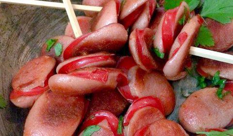 Готовое лакомство подается с теплым салатом или соусом ткемали (это тоже грузинское блюдо). Из бульона, в котором варились мясные сосиски, можно приготовить суп.