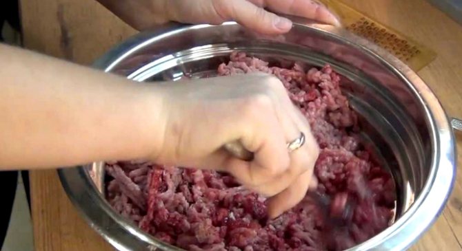 Измельченное мясо и сало нужно смешать, добавить измельченный лук, любимые специи, соль, выдавить чеснок. Фарш вымешивать на протяжении 15-20 минут, а затем отправить в прохладное место на несколько часов. За это время все компоненты связываются друг с другом, в результате фарш не рассыпается и хорошо держит форму.