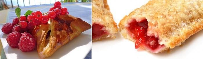 Фрукты для начинок берут плотные и не выделяющие много сока. Ягодам свойственно при выпекании выделять много сока, поэтому подойдут любые – вишня, брусника, ежевика, малина. Чтобы сок не вытекал, к начинке добавляют немного картофельного крахмала. Это никак не скажется на вкусовых качествах, но лишний сок впитается крахмалом. В качестве фруктовых и ягодных начинок можно использовать уже готовое варенье или повидло.