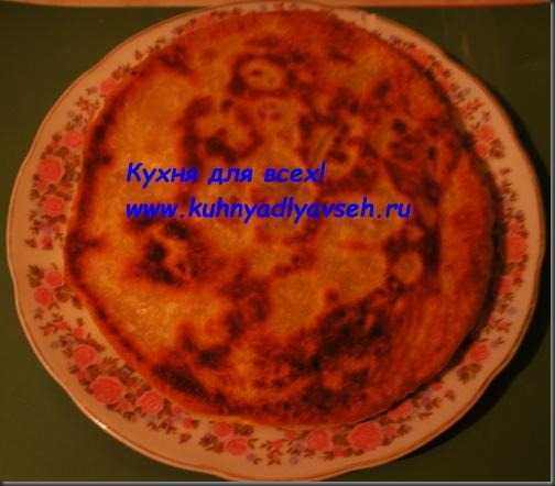 Печётся он с одной стороны 3-4 минуты. Степень поджаренности проверяем, аккуратно приподнимая край пирога. По готовности переворачиваем пирог и печём вторую сторону